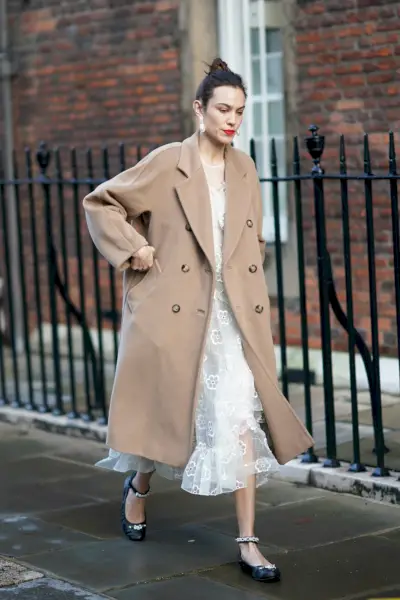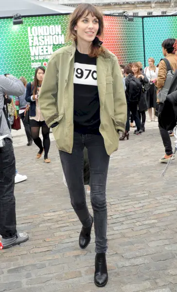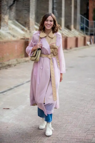 Pochi mesi dopo, Chung ha sfoggiato un look da trench molto diverso in un modello Simone Rocha in tulle rosa a cui ha aggiunto il suo solito stile da maschiaccio abbinandolo con jeans Levi vintage e le sue sneakers Alexa Chung x Superga.