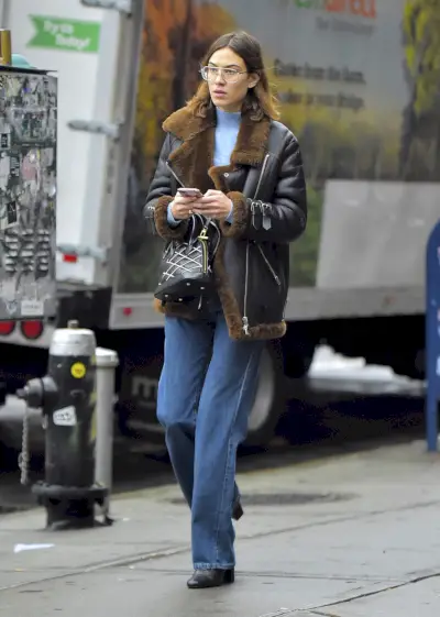 Per stare comoda durante la stagione invernale a New York City, Chung indossava un cappotto di shearling oversize con i suoi fidati jeans e un dolcevita celeste.