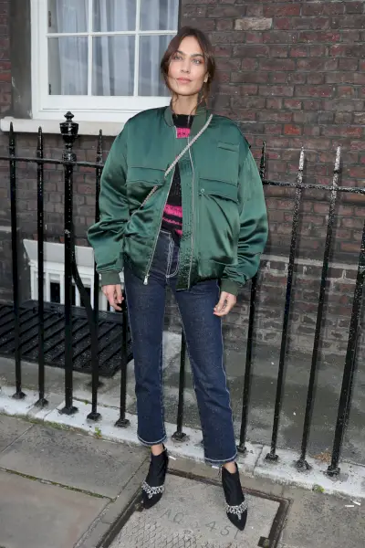 Un altro momento casual della settimana della moda per Chung è arrivato alla sfilata di Simone Rocha a Londra, dove la presentatrice televisiva sedeva in prima fila indossando un bomber verde di Katharine Hamnett. Chung ha scelto un maglione nero e rosa della sua linea di moda appena lanciata, oltre a un paio di jeans corti che mettevano in risalto le decorazioni di cristalli sui suoi stivaletti.