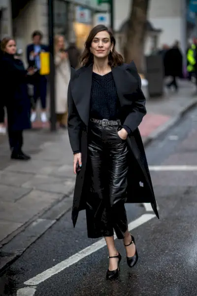 Esperto di look total black, Chung è stato avvistato durante la London Fashion Week con un cappotto nero indossato sopra un maglione lavorato a maglia e pantaloni di pelle corti con cintura in vita.