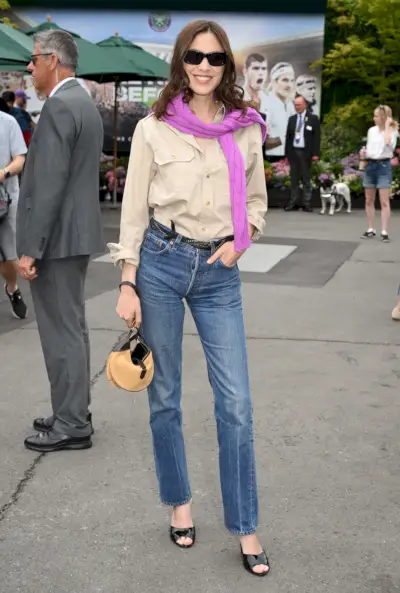 Le scelte sartoriali preferite di Chung erano a abbinamento perfetto per Wimbledon , dove ha dato un tocco di colore ai suoi Levi's vintage e ad una camicia abbottonata neutra con un maglione fucsia lavorato a trecce legato intorno alle spalle.