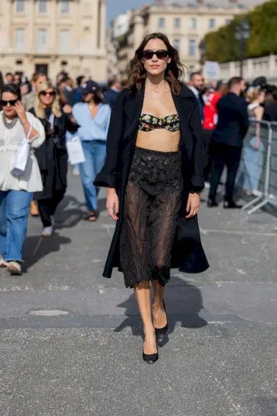 Mentre si recava alla sfilata Dior primavera 2024, Chung ha introdotto una visione diversa dell'abito nudo abbinando un reggiseno a balconcino ricamato a fiori e slip abbinati a vita alta con una gonna trasparente e un cardigan indossato sotto un cappotto più classico (tutto della collezione Dior collezione autunno 2023).