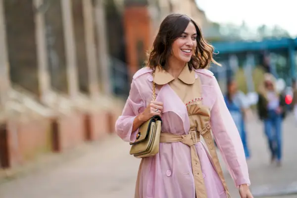Alexa Chung indossa un trench bicolore beige rosa fuori Rochas durante la London Fashion Week di settembre 2019.(Foto di Christian Vierig/Getty Images)