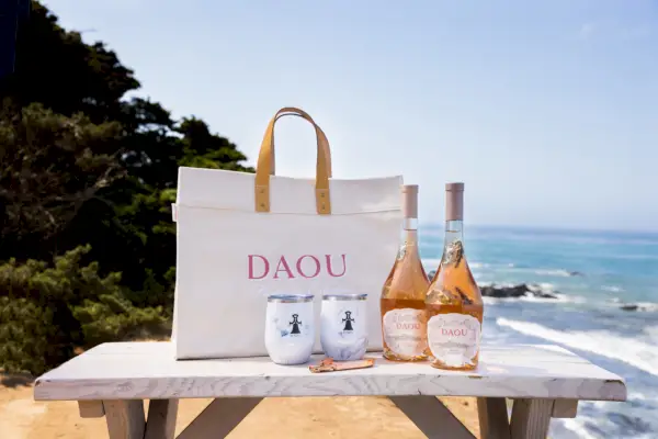Porta il picnic a casa con questo affascinante set, che include due bottiglie di rosa, un'elegante borsa di tela, due bicchieri di marmo e una chiave per vino rosato. $ 175, Daou .