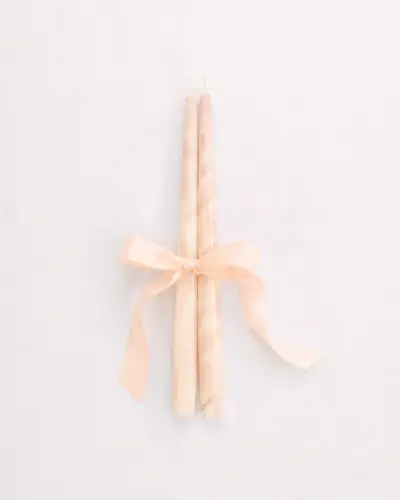 Queste graziose candele rosa coniche marmorizzate a mano sono l'accessorio perfetto per una tavola estiva. $ 22, Rosa Violacea .
