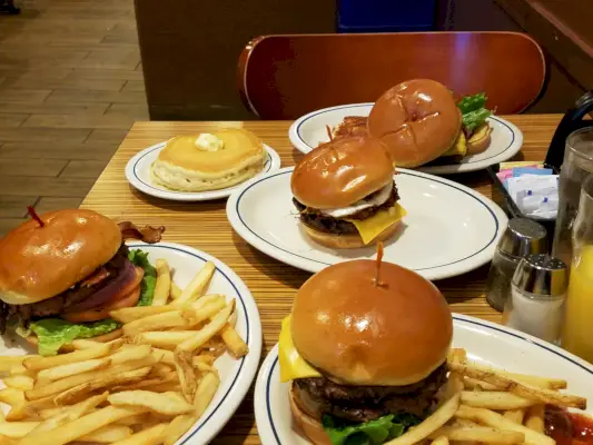 Mi sono seduto e ho ordinato un succo d'arancia: ce l'hanno ancora! - e quattro hamburger: The Classic (lattuga, pomodoro, cipolle, bacon, americano), The Patty Melt (cipolle saltate, americano, su segale), The Cowboy (pancetta, anelli di cipolla) e The Big Brunch (pancetta, uovo fritto , patate croccanti, formaggio), con patatine fritte e contorno di pancakes. Tutti vengono con la salsa IHOP tipica, ad eccezione del Cowboy, che ha il barbecue. Nessuno sembrava sapere cosa c'è nella tipica salsa IHOP. Altri misteri.