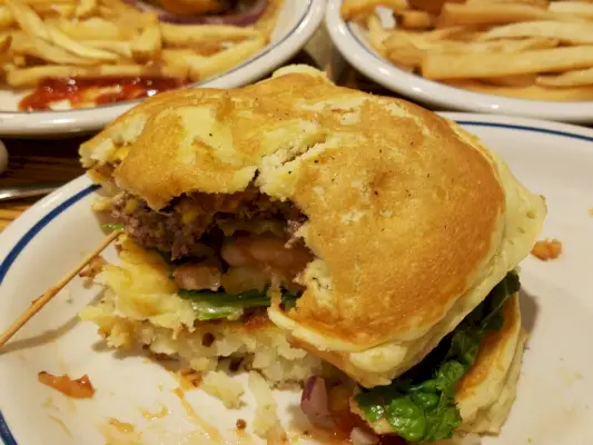 Il classico: Un nome davvero audace per una catena che non ha mai servito hamburger prima. Il classico era fondamentalmente una versione più piccola del Monster, senza i sottaceti per qualche motivo, quindi ho deciso di divertirmi e sostituire il panino con i miei pancake. Mi è piaciuto così tanto il Big Brunch che volevo mantenere vivo il tema dell'IHOP, inoltre quei famosi pancake burrosi dell'IHOP mi fissavano da quando erano arrivati. Il risultato è stato delizioso, anche se non così facile da tenere insieme. Questo è l'hamburger che mi aspettavo da una pancake house. Il sottile pancake avvolgeva l'hamburger in un abbraccio caldo e burroso.