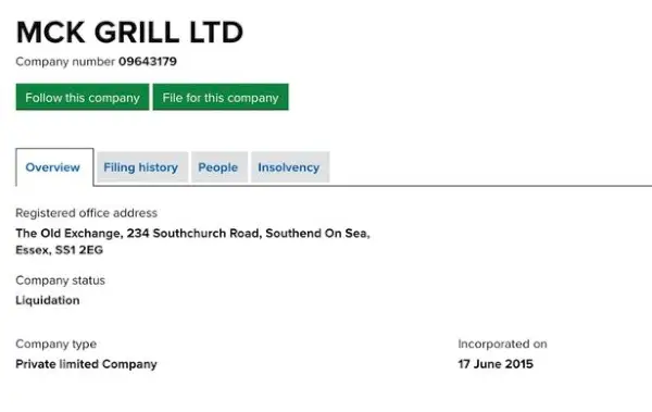 La Companies House mostra che McK Grill è in liquidazione