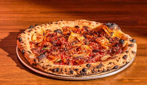 Per le pizze di Kim, come la torta barbecue coreana con guarnitura di galbi e la Lady Zaza con kimchi, maiale sakura, scalogno e sesamo, Netflix Bites ha utilizzato un forno a legna italiano personalizzato. Kim, di cui includono i ristoranti di Minneapolis Pizzeria Lola , Il giovane Joni E Sookie e io , ha anche una torta estiva al pomodoro e una torta di sottaceti del Minnesota nel menu a comparsa.