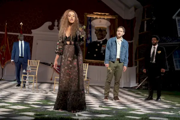 C’è un altro paragone, questo strano. Un grande ritratto al centro della scena mostra il defunto re Amleto come un dignitoso generale dell'esercito, con il petto decorato con medaglie. È difficile ignorare la somiglianza con il bel Leon dalla mascella squadrata. Se il dipinto sia uno scherzo o abbia un significato più profondo, non ne ho idea. Almeno mi ha dato qualcosa su cui riflettere mentre sedevo per quasi tre ore di Dane recitato in modo irregolare e messo in scena in modo blando. Viene da chiedersi che mondo sia questo Frazione è ambientato nell'America contemporanea, distrutta e disillusa dopo il 6 gennaio, il Covid, George Floyd e un circo politico senza fine? Nessuna risposta arriva, quindi soppesiamo i singoli elementi.