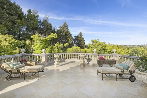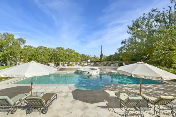 Una doppia scala offre una transizione dal grande ingresso agli alloggi privati della casa, che dispone di nove camere da letto e 14 bagni, tra cui un'ampia suite principale. La suite matrimoniale ha una coppia di bagni, enormi armadi e una grande terrazza coperta che incombe sull'enorme piscina e sul paesaggio verdeggiante sul retro della casa.