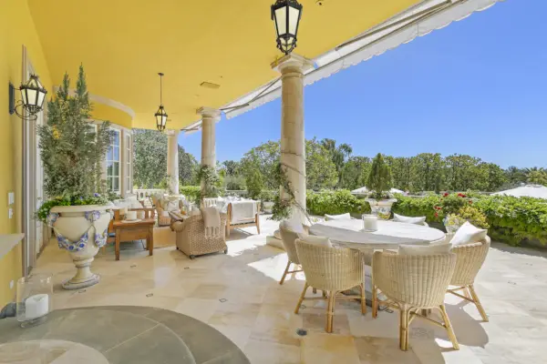 Il piano principale offre impressionanti capacità di hosting, con una grande sala con pavimenti in legno intarsiato e un bar dipinto a mano. Le sue porte-finestre si aprono su una loggia coperta che si affaccia sui terreni della tenuta.