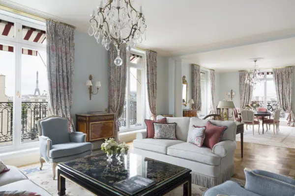Lo storico hotel Art Déco è una destinazione in sé e per sé ed è perfettamente decorato con lampadari fiorentini del XVIII secolo nella hall, arazzi fiamminghi del XVII secolo e una serie di mobili classici francesi in stile Luigi XVI e Napoleone I del XIX secolo. . Ci sono 244 camere e suite, tutte con bagni in marmo e lampadari a braccio, e molte delle suite più lussuose offrono una vista sulla Torre Eiffel.